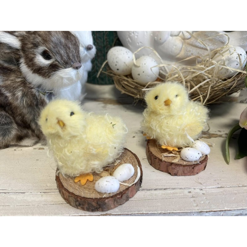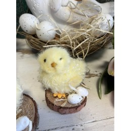 Kuriatko na drevenom podstavci s vajíčkami.